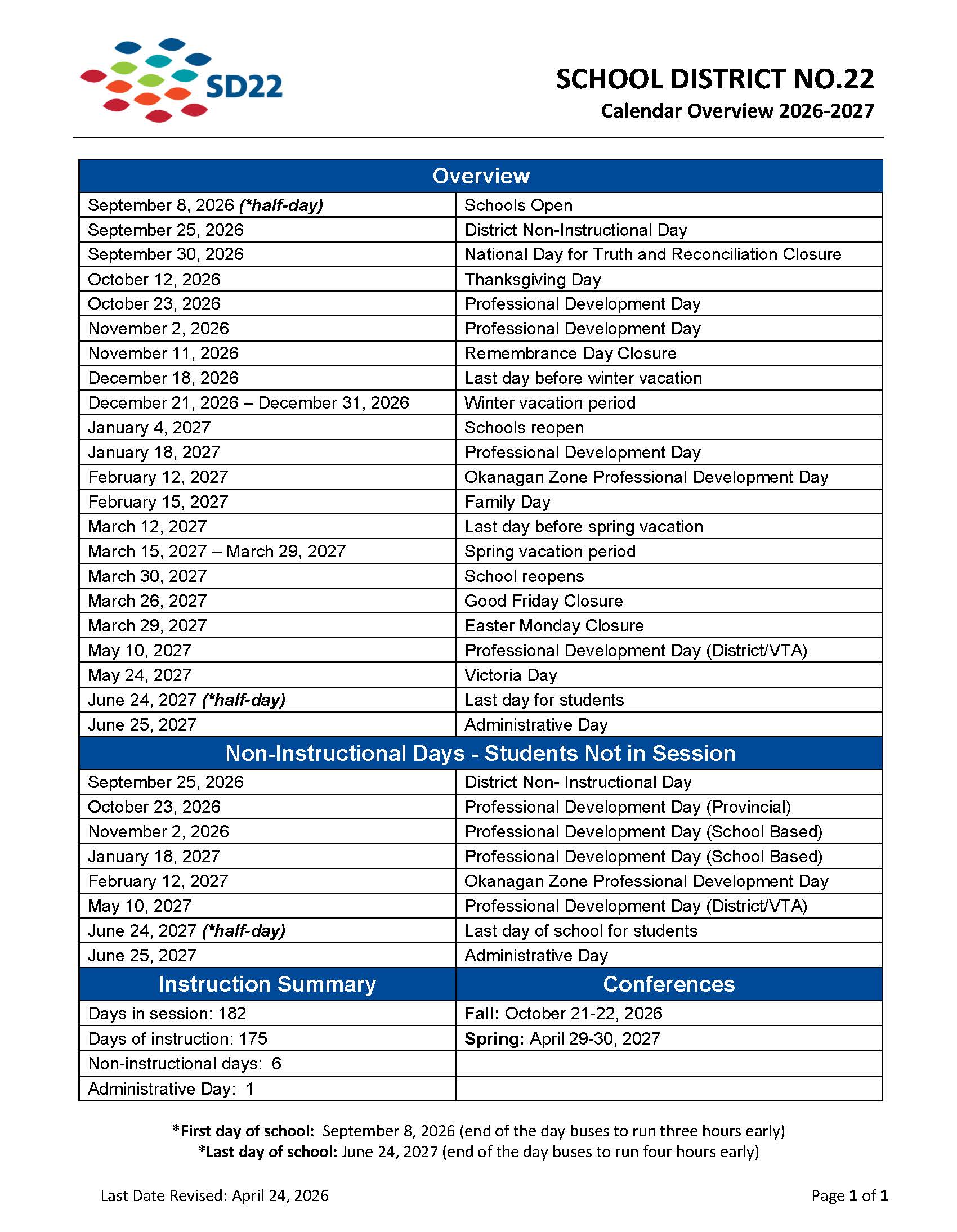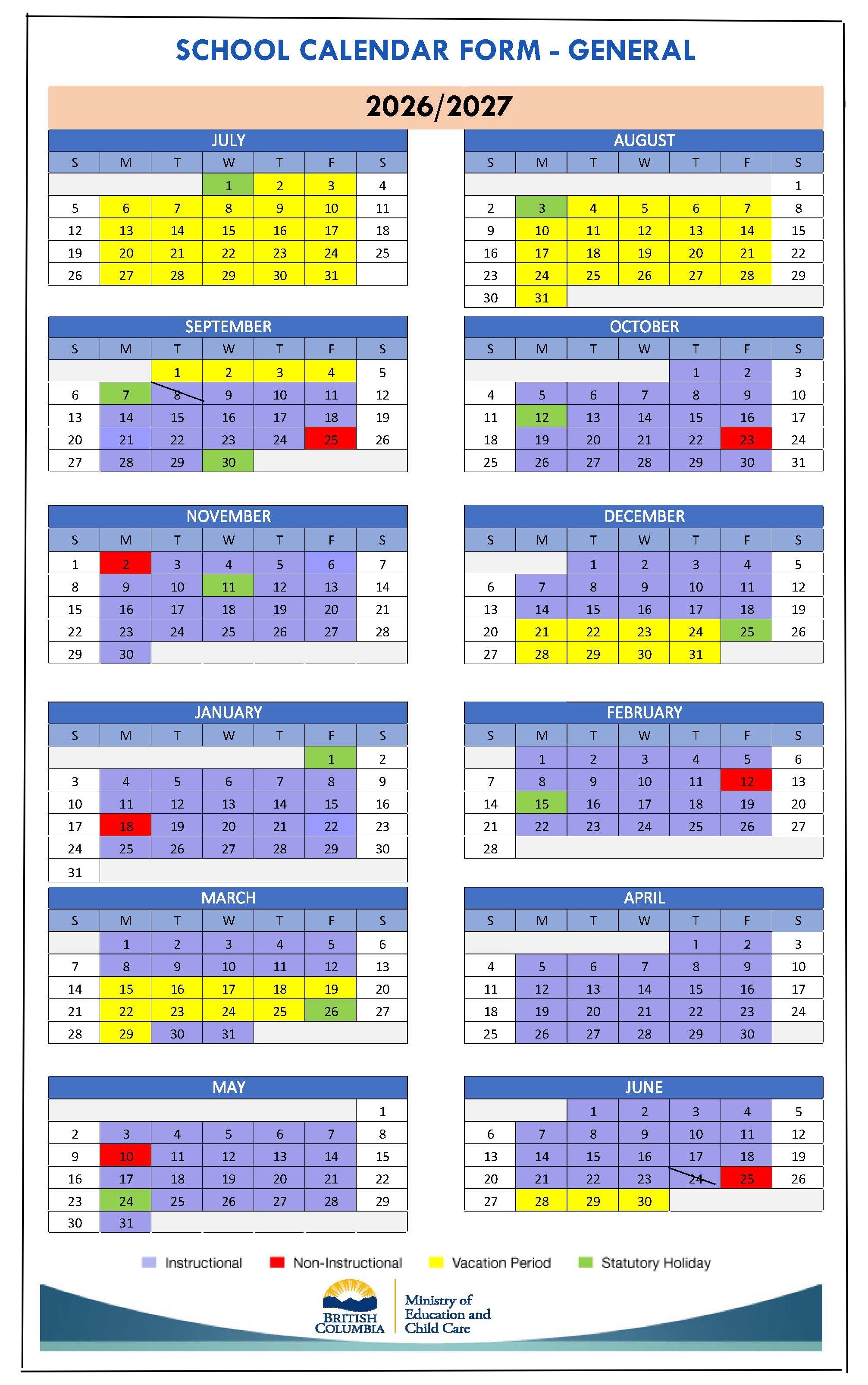 The 2026/27 and 2027/28 draft calendars were approved by the Board of Education at the January 21, 2026 meeting. These calendars have now been approved by the Ministry of Education.